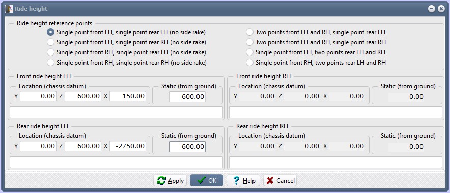 The rear ride height location will be 0.00, 600.00, -2750.00 and the static ride height 600.00.It is important that both front and rear ride height locations and ride heights are specified, as these two points control the calculated position of the chassis mounting points, relative to the ground. In this case, where the ground is also the chassis vertical datum, then the critical dimensions are that the "Z" dimension and the Static ride height must be identical, and that the two location points are "longitudinally separated".