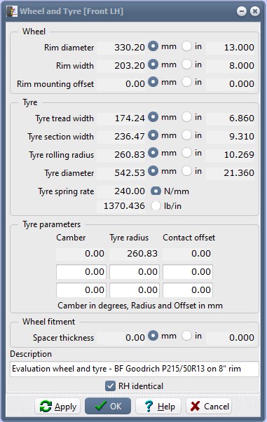This allows us to specify the swing axle and roll centre dimensions, which will then "back calculate" the wishbone chassis mounting heights.Specify the wheel location and alignment as "Wheel location and alignment".
