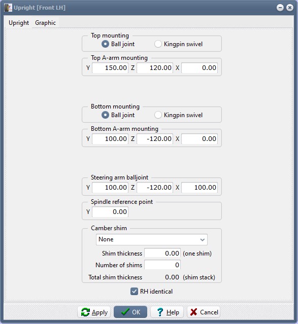 The upright top and bottom wishbone mountings are fixed in the demo version. If you are using the registered version, then enter all dimensions.