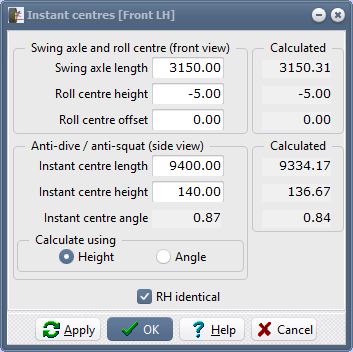 Make sure that "Calculate using" is set to "Height", and "RH identical" is ticked, then click OK.Why specify the side view instant centre height of 140mm?