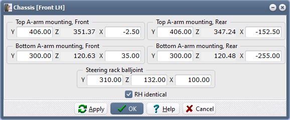Because we are specifying the swing axle length and the roll centre height, we only need to specify the lateral and longitudinal dimensions of the top and bottom wishbone mounting points.