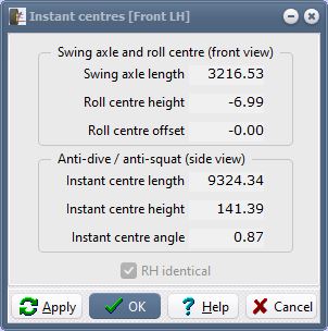 Notice that the instant centre values have also updated. The swing axle length is now 3216.53 and the roll centre height is –6.99. Also the side view instant centre length is now 9324.34 and the height 141.39.