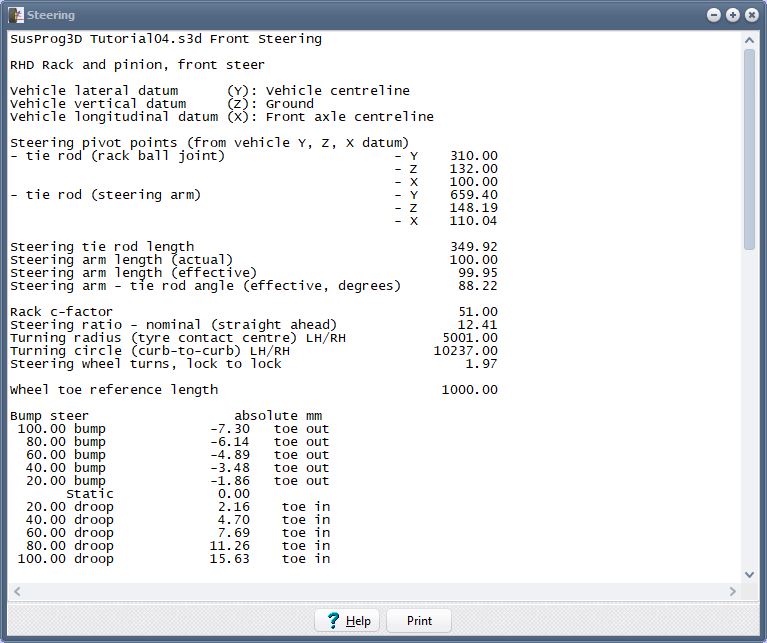 We had previously entered the steering rack and steering arm ball joint dimensions, so we will use them do the calculations.
