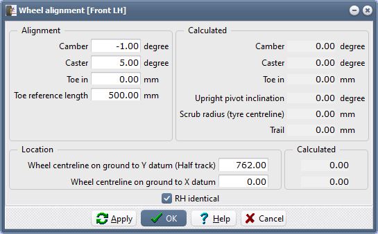 Specify the toe reference length as 500.00mm. Note that if we had specified the wheel toe settings as "degree" then there is no input for toe reference length.Specify the "half track" as 762.00 (this will then result in a track of 1524.00mm).