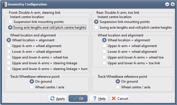 This allows us to specify the swing axle and roll centre dimensions, which will then "back calculate" the wishbone chassis mounting heights.Specify the wheel location and alignment as "Wheel location and alignment".