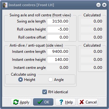 Make sure that "Calculate using" is set to "Height", and "RH identical" is ticked, then click OK.Why specify the side view instant centre height of 140mm?