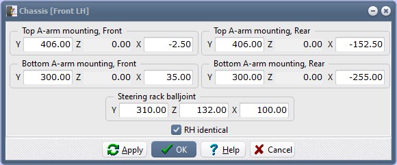Specify the top wishbone mounting X dimensions as -2.50 and -152.50 for front and rear respectively.The bottom wishbone lateral dimension will be 762.00 (half front track) minus 100.00 (the upright bottom ball joint) minus 262.00 (the nominal wishbone length) giving 300.00.