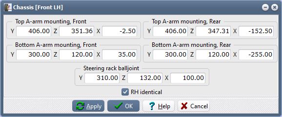 Because we are specifying the swing axle length and the roll centre height, we only need to specify the lateral and longitudinal dimensions of the top and bottom wishbone mounting points.