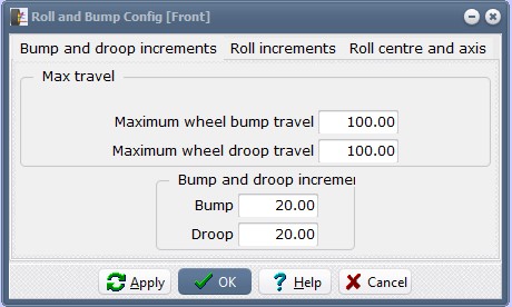 In Bump and droop increments, set the maximum and minimum travel to 100.00 and both bump and droop increments to 20.00. Click Apply.