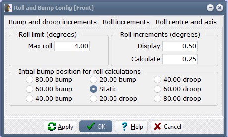 In Roll increments, set the maximum roll to 4.00 degrees, the roll increments to 0.50 (for display) and 0.25 (for calculate) and the initial bump position at “Static”.