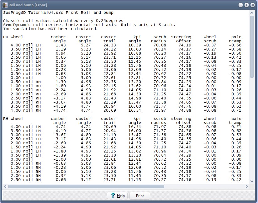 Now you can see how the wheel alignment values change as the vehicle is rolled laft and right, and the wheel is bumped and drooped.