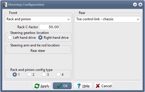 Set the steering type to “Rack and pinion”; the C-factor to 50.00; the steering gearbox location to either LHD or RHD; and the rack and pinion config type to “1”.