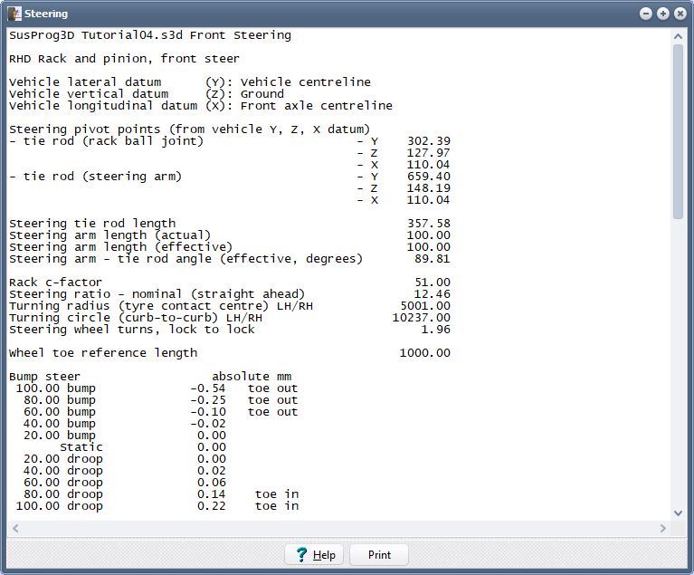 We had previously entered the steering rack and steering arm ball joint dimensions, so we will use them do the calculations.