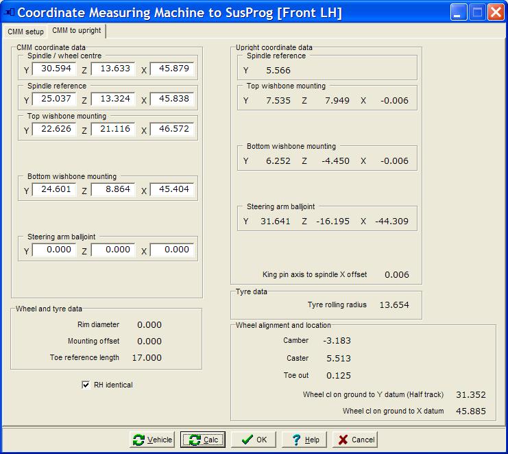 The upright dimensions are all calculated relative to a vertical king pin axis (in side view). In this example, because the longitudinal axis is positive rearwards, the positive value indicates that the spindle is behind the strut rod axis 0.006", hence the strut rod X data points are negative (ie in front of the spindle by 0.006").If "identical" is ticked, then the specified CAD coordinates will be calculated for the opposite side of the vehicle as well.