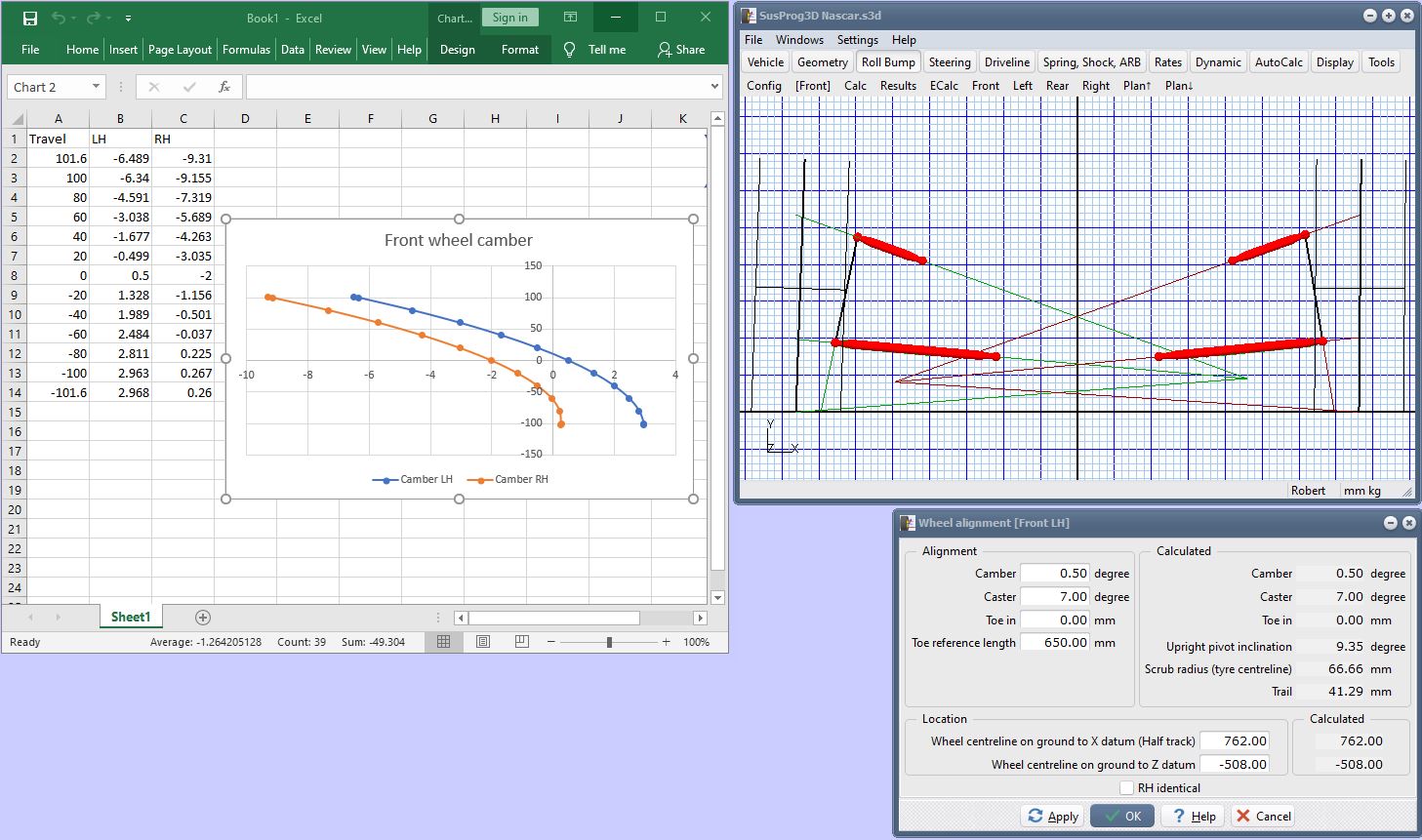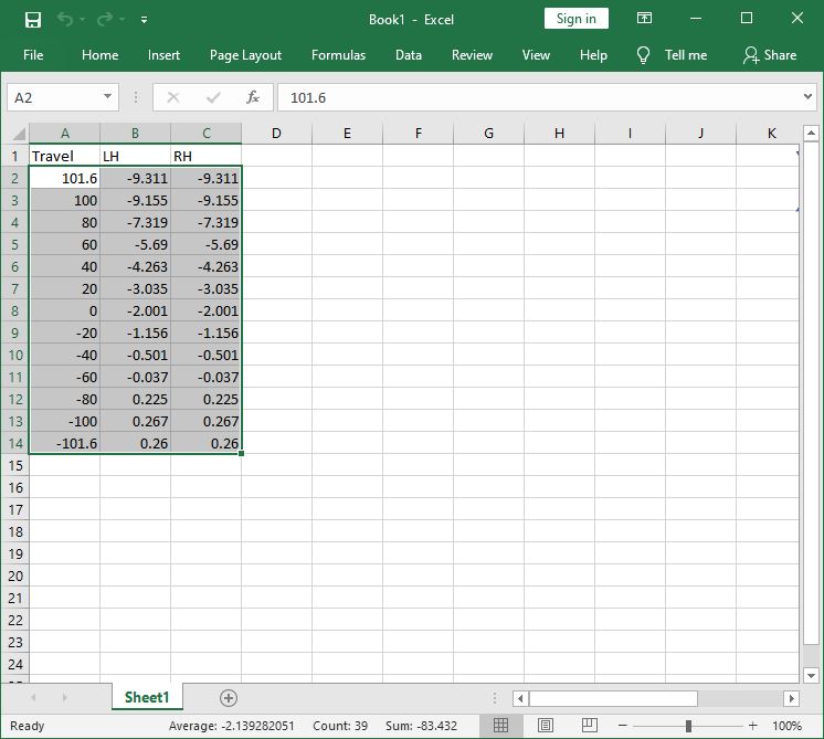 The three blocks of cells will now update with the travel and camber