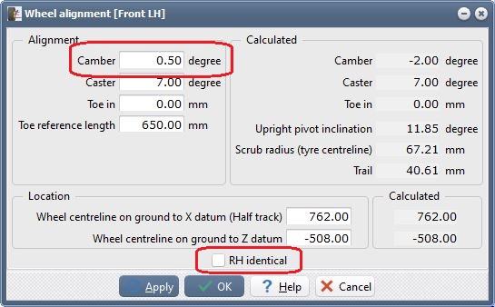 Now we will change the static camber of the LH wheel (and make it different to the RH wheel).